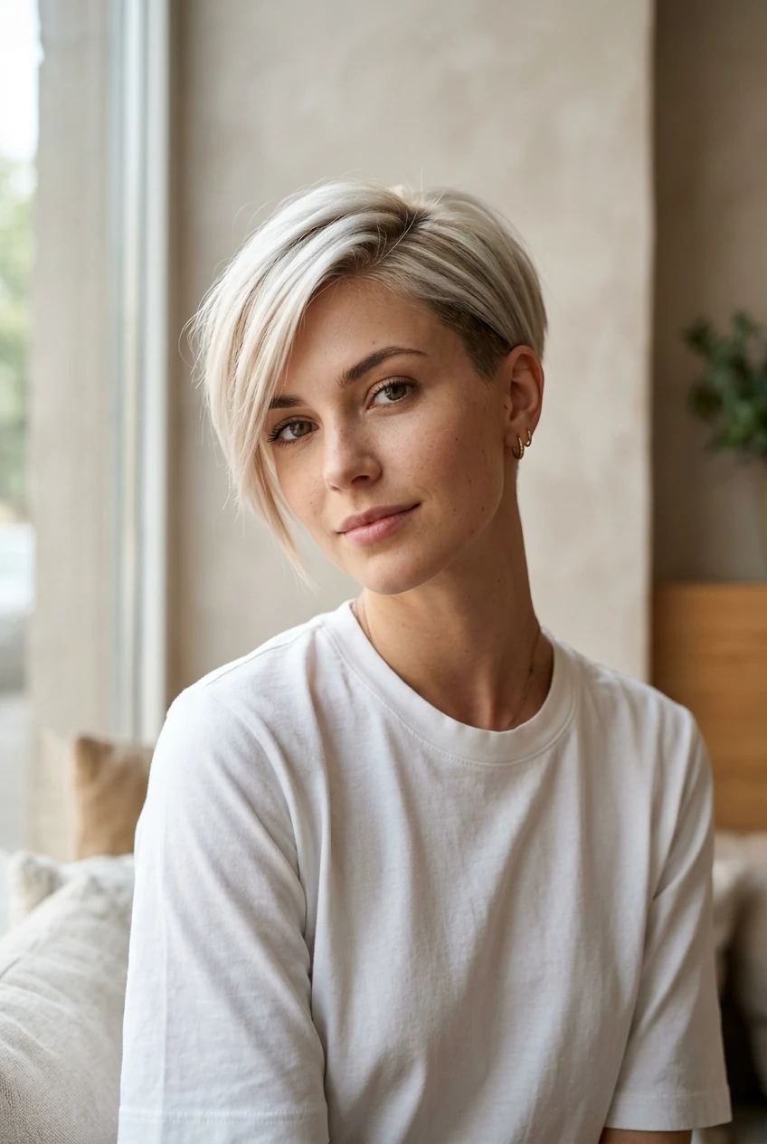 Contrast is your friend. That means if you’re naturally brunette, don’t be afraid of platinum pieces. If you’re blonde, consider some deeper lowlights. The short length means bold color choices won’t overwhelm your features — they’ll enhance them. Plus, with less hair to maintain, you can actually afford those salon-quality treatments more often.